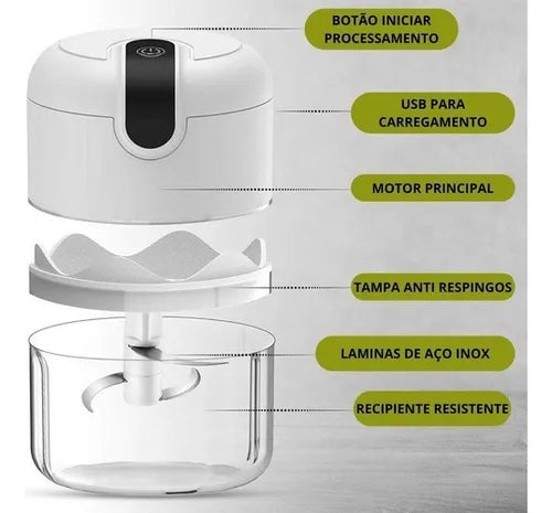 Processador Elétrico Compacto Branco, Moedor Automático de Alho e Cebola sem Fio, USB, Capacidade 250 ml